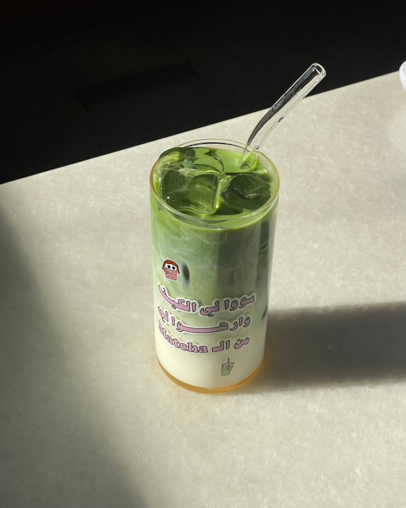 كأس أنيق وشفاف يبرز لون الماتشا الجميل، ويجي مع عود شرب زجاجي يكمّل التجربة بشكل بسيط وممتع.
